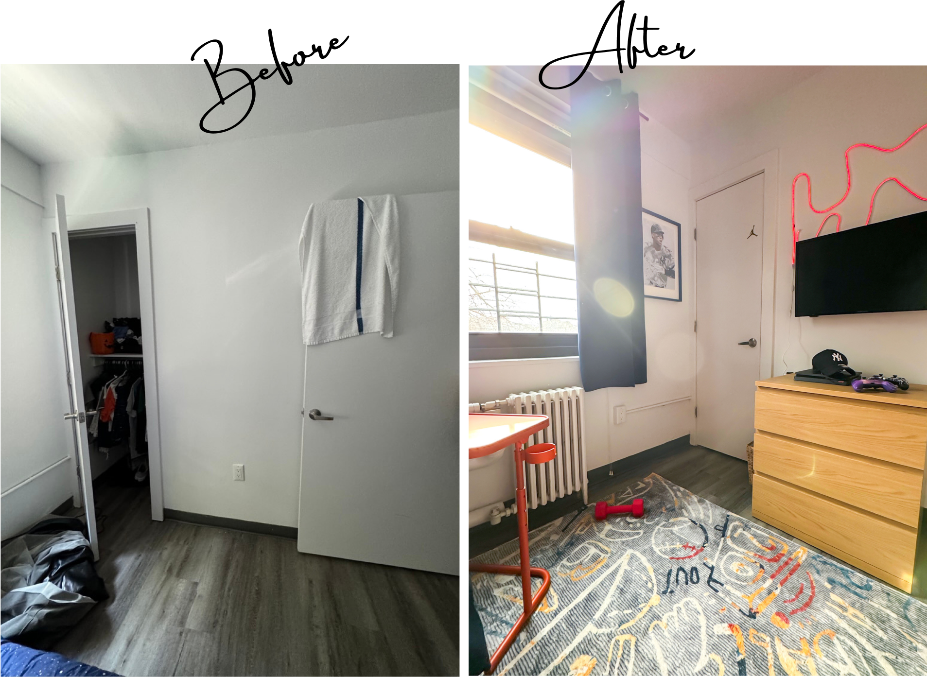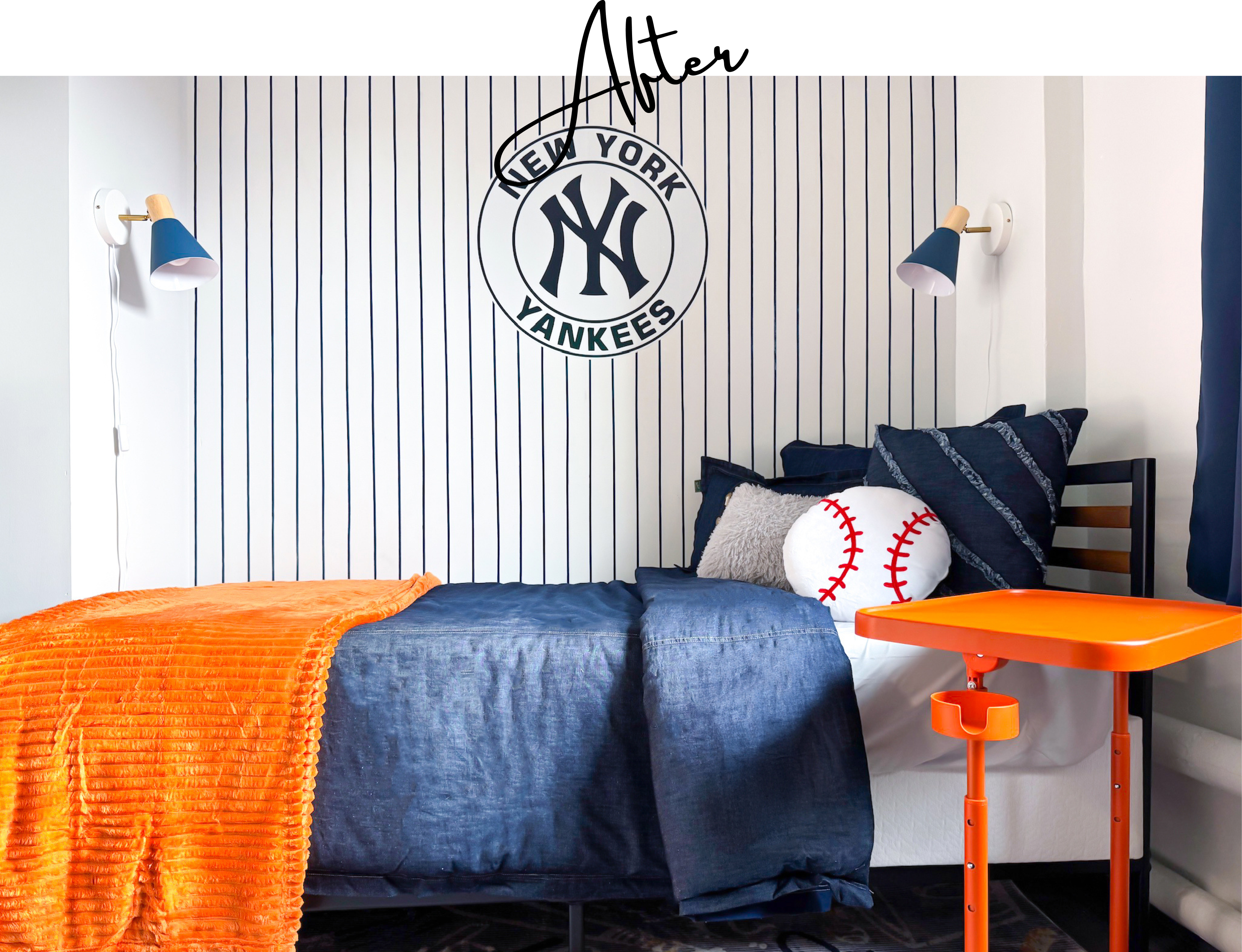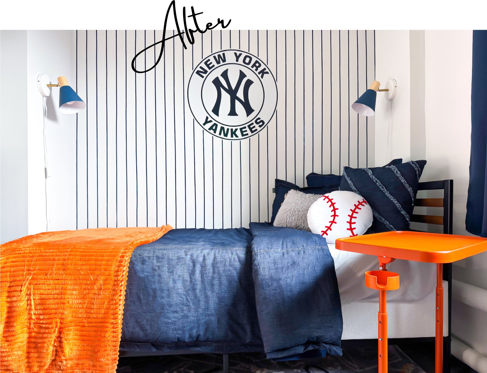 From Yankee decals to fine pinstripes, Carlos’s room is more than just aesthetics - it’s a space designed to bring him comfort, joy, and a sense of ownership over his world. His favorite colors surround him, wrapping the walls in familiarity, while his bed proudly showcases the image of his hero, Aaron Judge. A soft yet durable rug cushions his steps, blackout curtains offer restful sleep, and carefully placed shelves and a dresser bring order to his cherished belongings.
